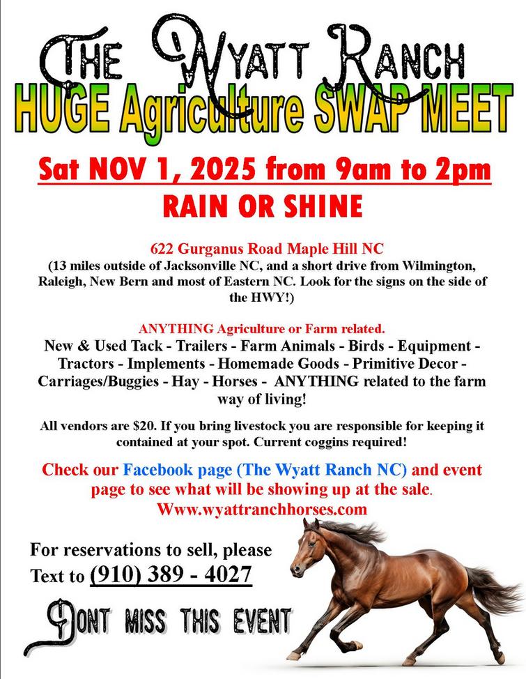 FALL 2025 Wyatt Ranch Tack, Equipment and Livestock Sale and Swap. Come to Buy & Sell ANYTHING farm related! Equipment or Livestock. Details on how you can sell and preview of items to buy will be listed as we get them in! Please check our FB Page for new updates and items that will be at the sale! Please share!!!
